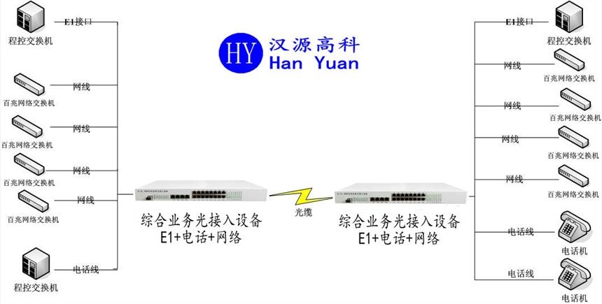 ? ?8路E1+8路电话+4路百兆网络综合业务光接入设备是汉源高科(北京)科技有限公司采用自主知识产权的大规模集成电路,应用时分复用技术,将电话信号、以太网信号和E1信号混合编码后在一对光纤上传输。实现百兆以太网、E1接口、普通电话、热线电话、磁石电话、V35业务、RS232/RS485/RS422数据业务、二/四音频、二/四线EM等混合传输,传输通道为光传输通道。该机采用19英寸、1U机框设计,集成度高,体积小,功耗低,工作可靠,安装使用方便。